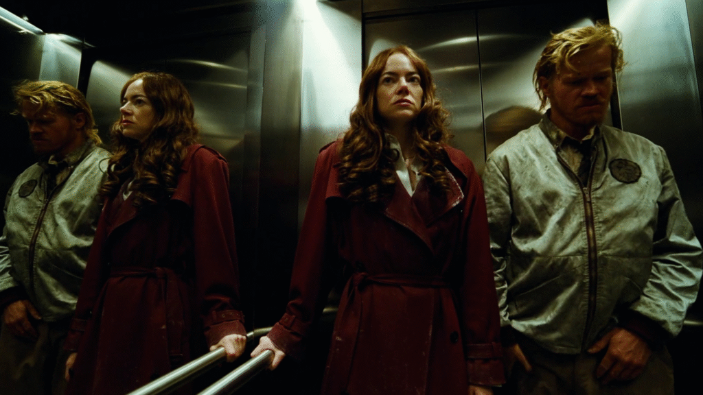 Emma Stone, mais uma vez, entrega uma performance de altíssima precisão. Seu papel exige autoridade, choque e incredulidade, e ela faz tudo com muito controle. Mas o filme pertence mesmo a Jesse Plemons. Seu personagem, completamente mergulhado nas próprias paranoias, é interpretado com uma convicção tão genuína que beira o assustador. Nada soa exagerado — é a verdade particular dele, uma vez que conhecemos o passado do personagem, e é isso que torna tudo tão engraçado e tão inquietante.