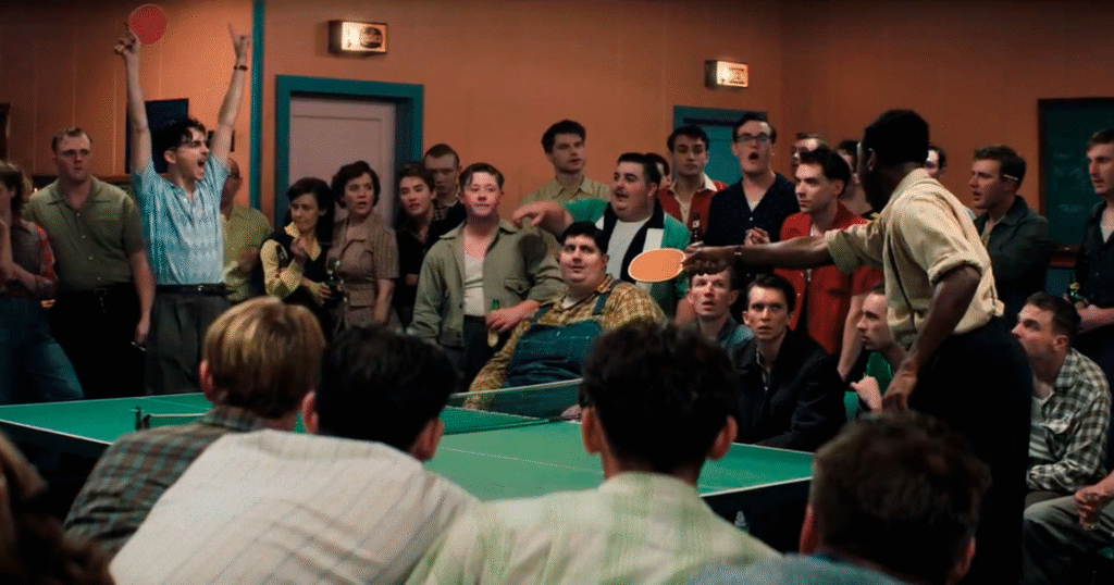 Mesmo sendo um filme sobre tênis de mesa, o esporte nunca é tratado como o verdadeiro centro da narrativa. Ele funciona como uma obsessão, um objeto de desejo, não como um fim. Há menos partidas do que o espectador espera, mas cada uma delas é longa, intensa e absolutamente funcional dentro da lógica do filme. Todas como parte da brilhante direção de Josh Safdie.