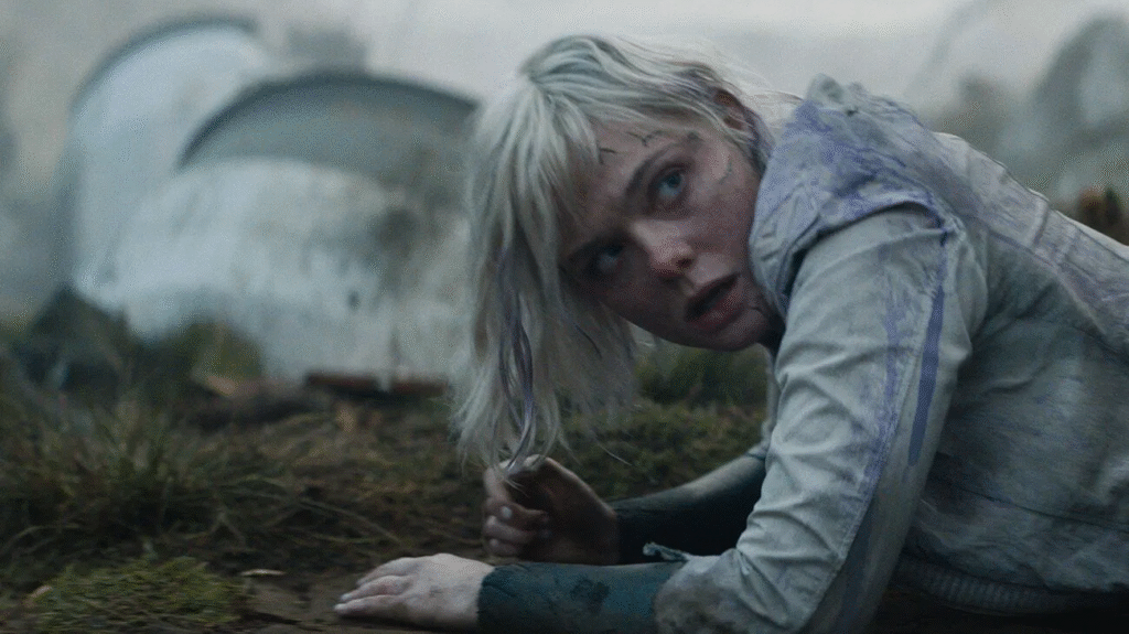Elle Fanning, claro, é o grande rosto humano do filme, interpretando não uma, mas duas sintéticas. Ela diferencia cada uma de forma tão clara que você esquece que são variações da mesma atriz. Mudanças de postura, fala, expressão e até ritmo corporal fazem as duas personagens parecerem seres totalmente distintos.