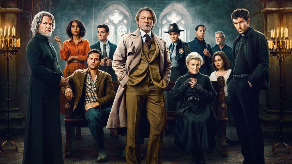 No centro desse tabuleiro está, mais uma vez, Benoit Blanc. Daniel Craig retorna ao papel com absoluto domínio, entregando pela terceira vez um personagem carismático, sagaz e irresistivelmente irônico. Blanc continua sendo um detetive que observa o horror sem perder o humor, equilibrando leveza e seriedade de maneira exemplar. Após esse terceiro filme, é difícil negar: Benoit Blanc já ocupa um lugar entre os grandes personagens icônicos do cinema contemporâneo.